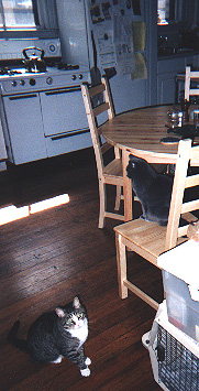 | Bel and Beek in the kitchen. We are very proud of our kitchen these days -- it used to look much more... mismatched. As you can see, our stove is Not Quite Original But Damned Close. Likewise our fridge. Dining table by IKEA. Cats by themselves. Beekman has such a talent for showing how huge his eyes are in every shot, and Beltane has a remarkable talent for looking elegant. At least, we think so. | ![]() |