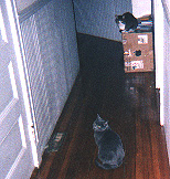 Beltane and Beekman in the hall, as you look out of K's room toward the front of the house. Door on the left is the Most Important Door In The House: the linen closet, where the cat food is kept. The doorway just barely visible on the right is my room. Yes, our hall bends there to accomodate the jigs and jogs instituted by the kitchen and the bathroom. |