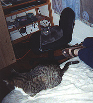 So here's Bel and Beek, hanging out on Kerey's computer chair and bed, respectively. Notice K's feet in the picture as well -- sadly, the pic I took of her playing with the cats scanned too dark. Sigh. In any case, please do note the elegant pose Beltane has struck for this, while Beekman is watching Perdita bolt. |
