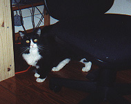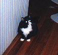 | Perdita, under Kerey's computer table, getting ready to bolt. | Perdita, in the doorway of Kerey's room. You can see her gorgeous, plush cravat and feather-boa tail in this, as well as other aspects of her "tuxedo." She bolted seconds later. | Perdita in the hallway, prevented from bolting by the distraction of a cat-toy. She stared at me, appalled, for several seconds after the flash went off, then scurried away, not to be found again for at least an hour. |